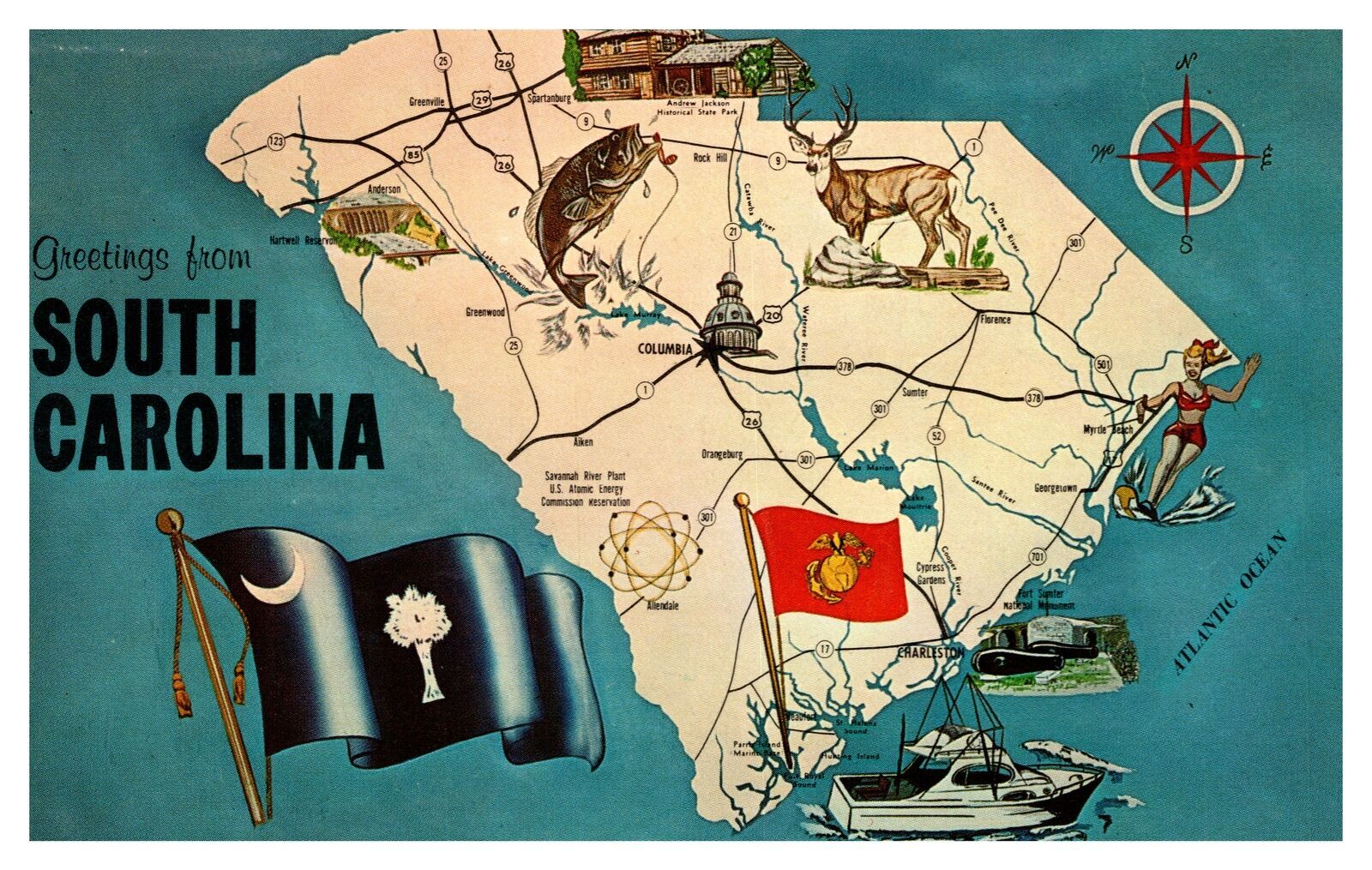Postcard SD South Dakota Map card with State Flag