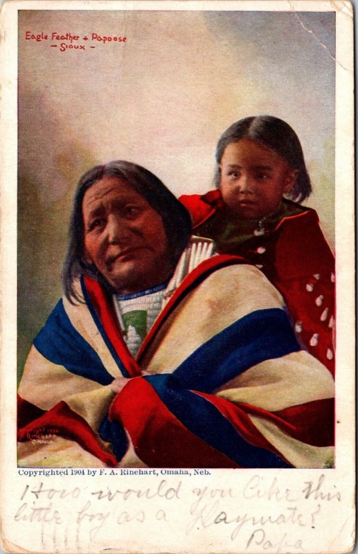 Postcard Sioux Indian Eagle Feather and Papose~2428