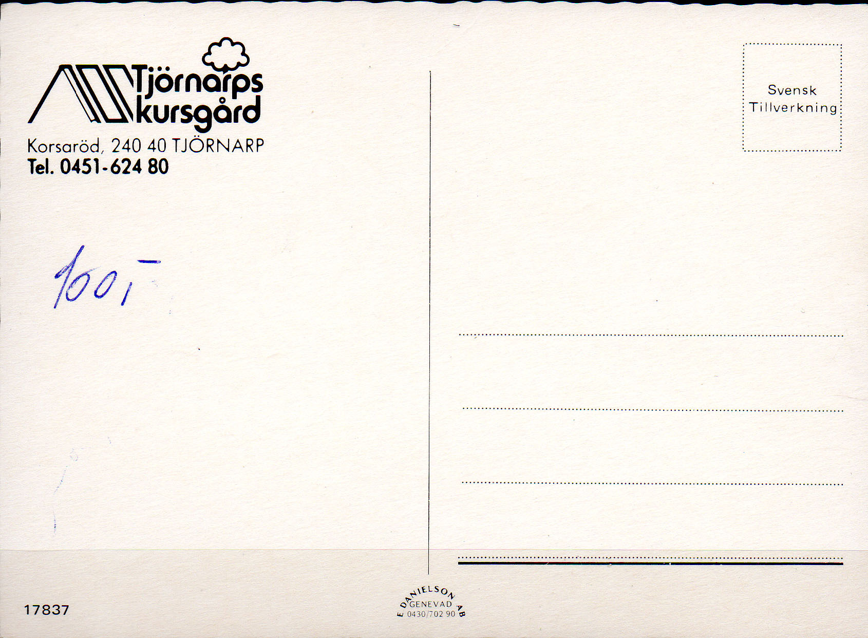 POSTCARD. SWEDEN. "Tjörnsarps kursgård". Unused. Copyr: E. Danielson SB. Genevad. Kv.1. LP0622-7Seller Information