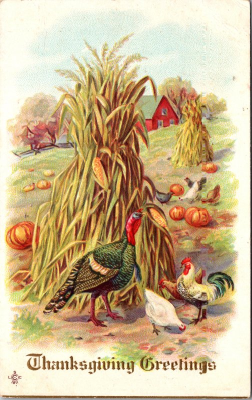 Postcard Thanksgiving Turkey Chickens Corn Shocks Farm Scene