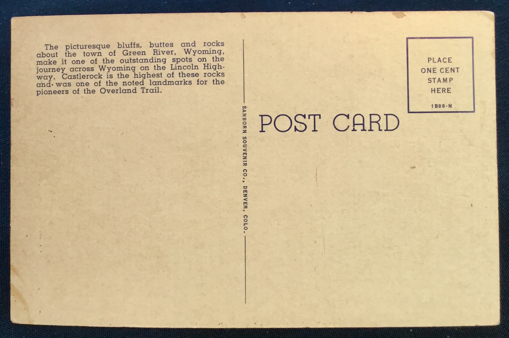 POSTCARD, Unused. 1088-Castle rock from Green River, Wyoming, Green River, Wyoming. ANY SHADOWS ARE DUE TO MY PHOTOGRAPHIC EXPERTISE. See Photo for Condition. Our goal is to provide sound stamps/Postcards (unless o ... Read More