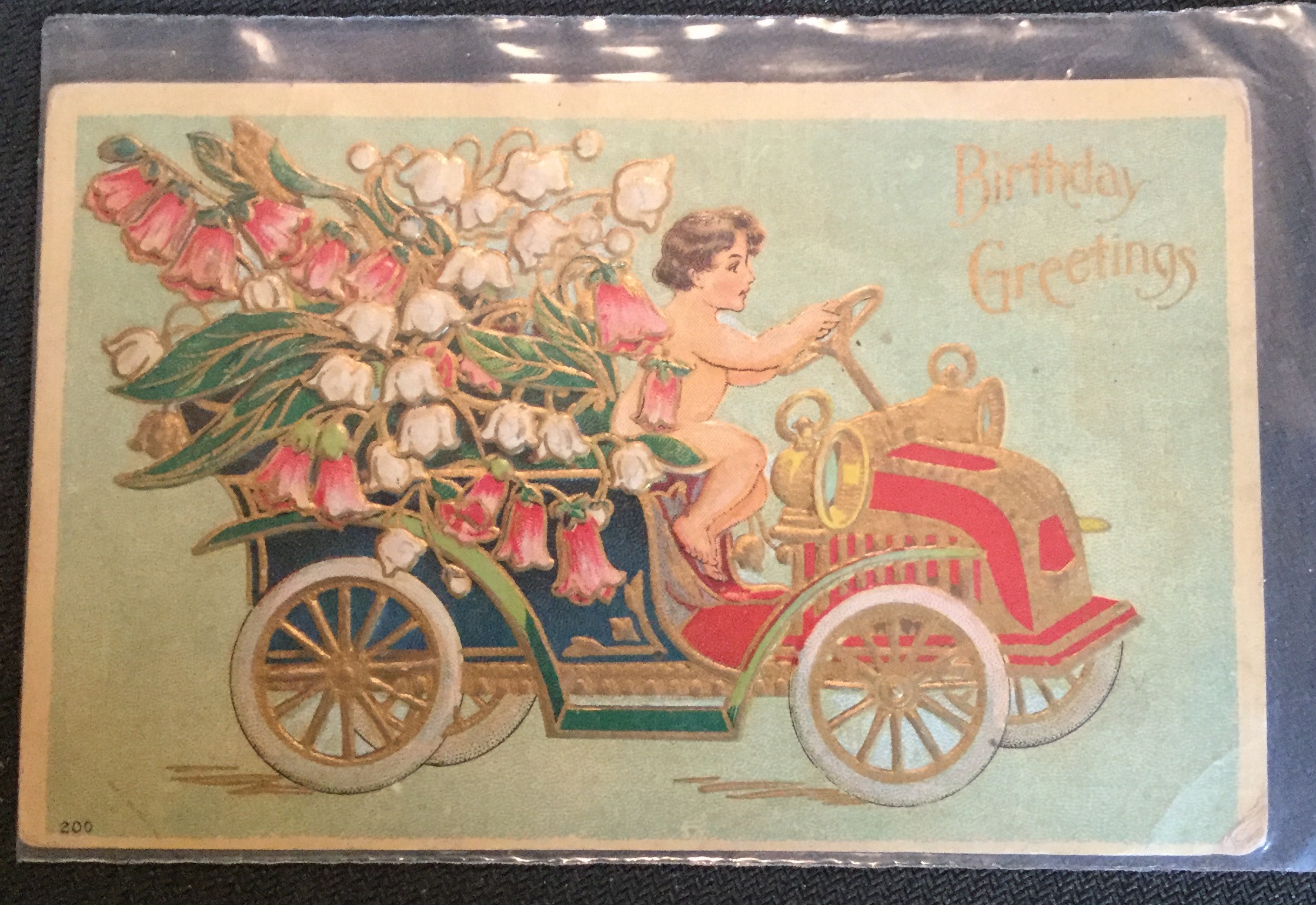 POSTCARD Ununsed, Embossed.. “Birthday Greetings”, Cherub/Truck/Flowers. ANY SHADOWS ARE DUE TO MY PHOTOGRAPHIC EXPERTISE.See Photo for Condition.
