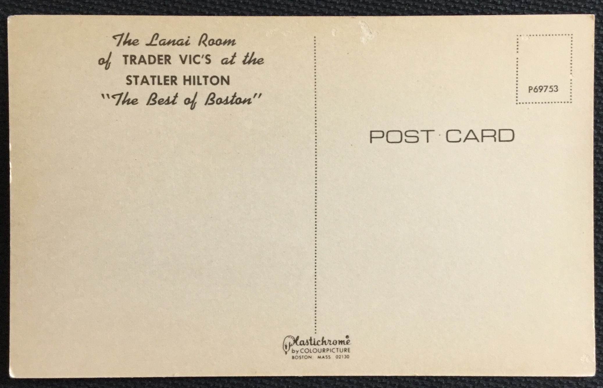 POSTCARD, UNUSED, LANAI ROOM, TRADER VIC'S at the STATLER HILTON, BOSTON, MASS. ANY SHADOWS ARE DUE TO MY PHOTOGRAPHIC EXPERTISE. See Photo for Condition. Our goal is to provide sound stamps/Postcards (unless other ... Read More