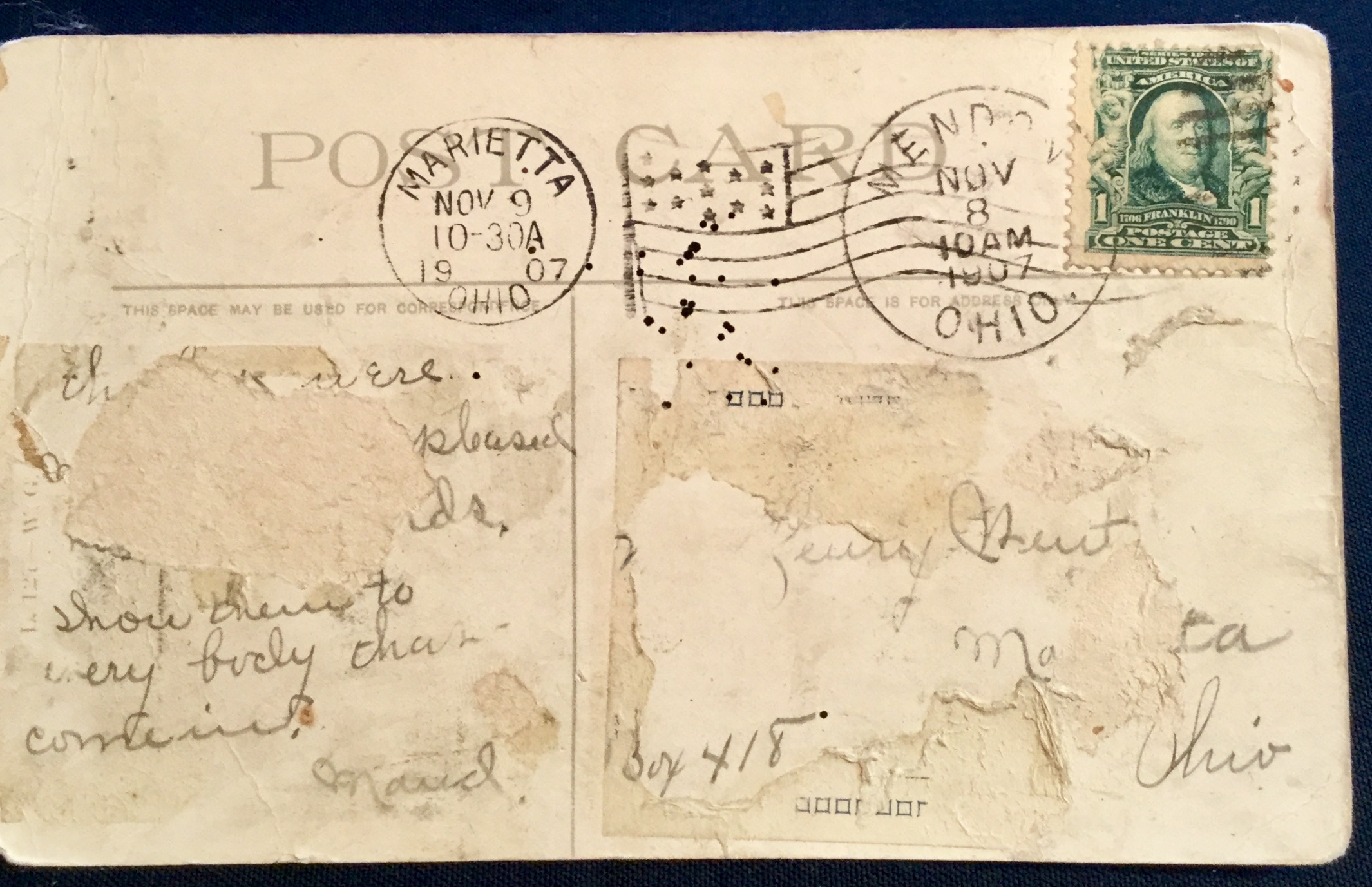 POSTCARD, Used, 2 boys, “And they say hens don’t lay”. Marietta, Ohio, 2 PM, 11/8-9/1907. ANY SHADOWS ARE DUE TO MY PHOTOGRAPHIC EXPERTISE.See Photo for Condition.