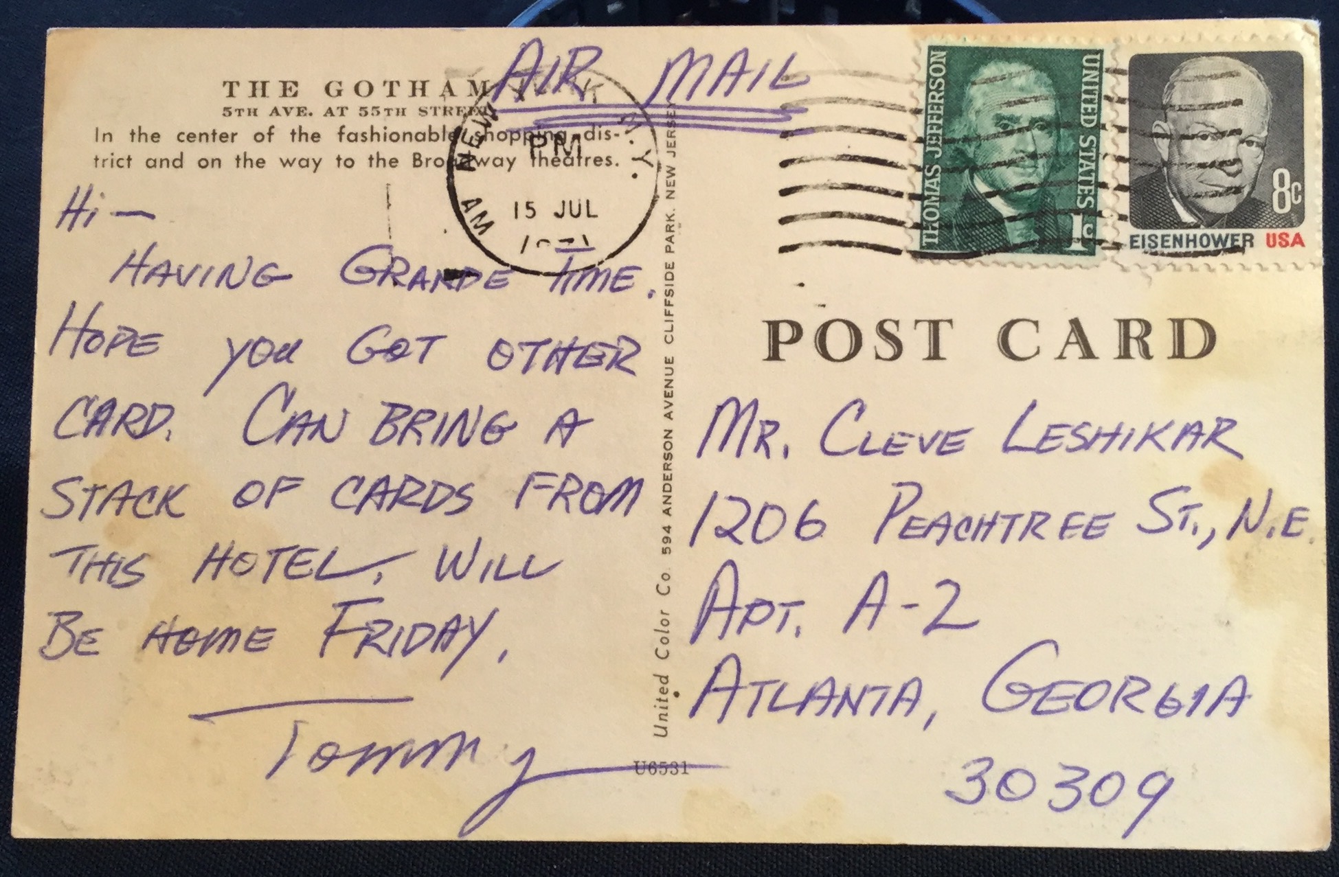 Postcard Used Gotham Hotel NYC NY LB