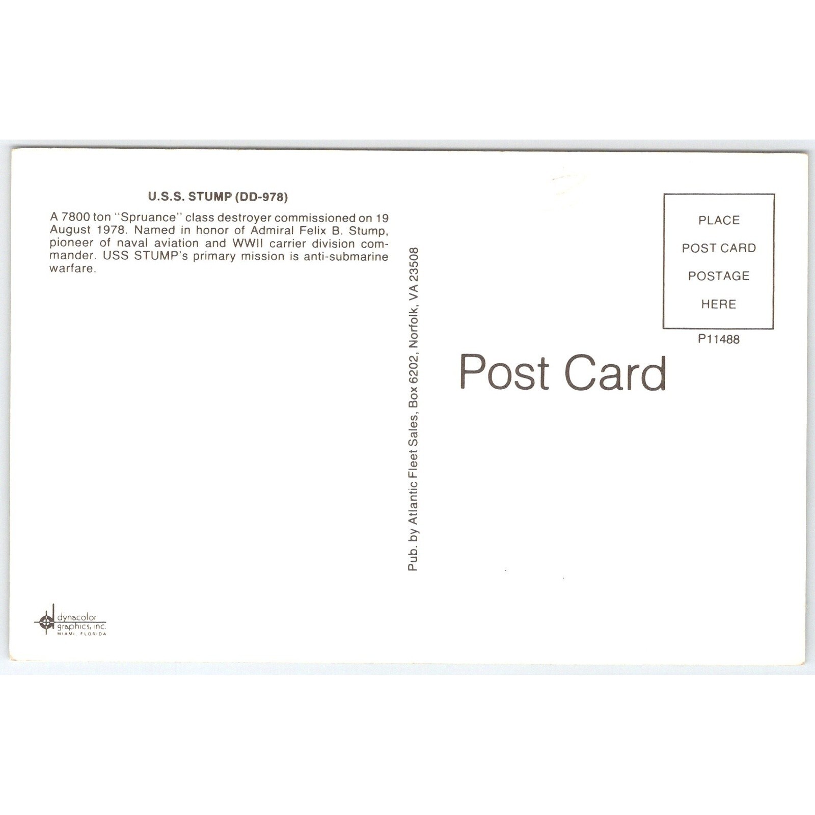 Postcard USS Stump DD-978 Spruance Class Destroyer Naval ShipYou will receive the exact postcard in the scans. This postcard features the USS Stump (DD-978), a Spruance class destroyer commissioned on August 19, 1978. Named in honor of Admiral Felix B. Stump, the ship's primary mission is anti-submarine warfare. Published by Atlantic Fleet Sales, Norfolk, VA.Please see my other items. I do combine shipping.