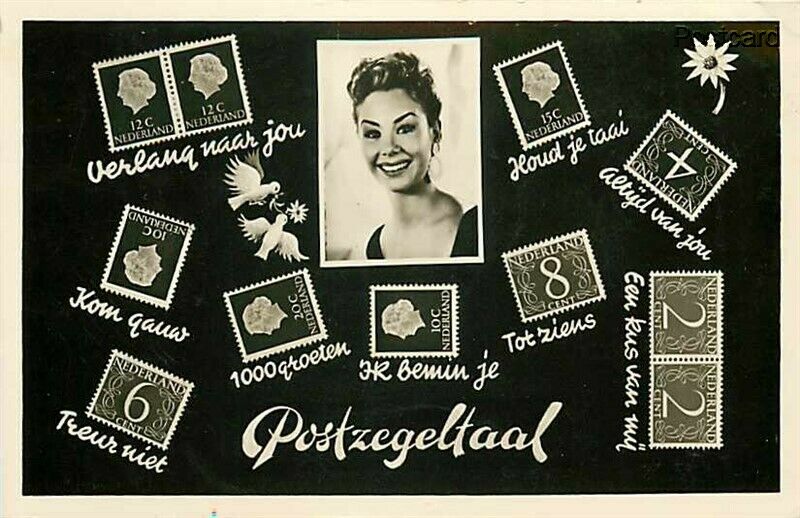 Real Photo Postcard Postzegeltall, Dutch Stamps Postmark: 1960 Image: Sharp and clear Corners: Light wear Faults/Other: Small crease top right corner