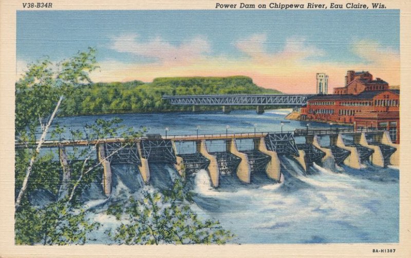 Power Dam on Chippewa River - Eau Claire, Wisconsin. Standard sized linen post card. The Curt-Teich Dating Guide assigns 8A-H1387 to 1938. Very good condition.