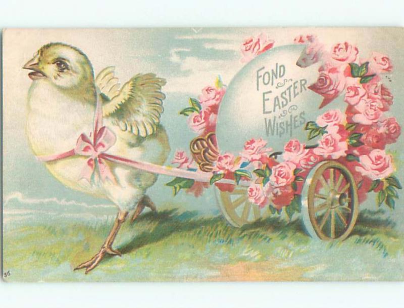 Pre-1907 easter CHICK PULLS EGG AND ROSE FLOWERS ON CART J1955