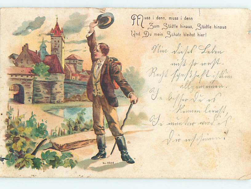 Pre-1907 foreign TRAVELING MAN WAVES WITH HIS HAT HL7265