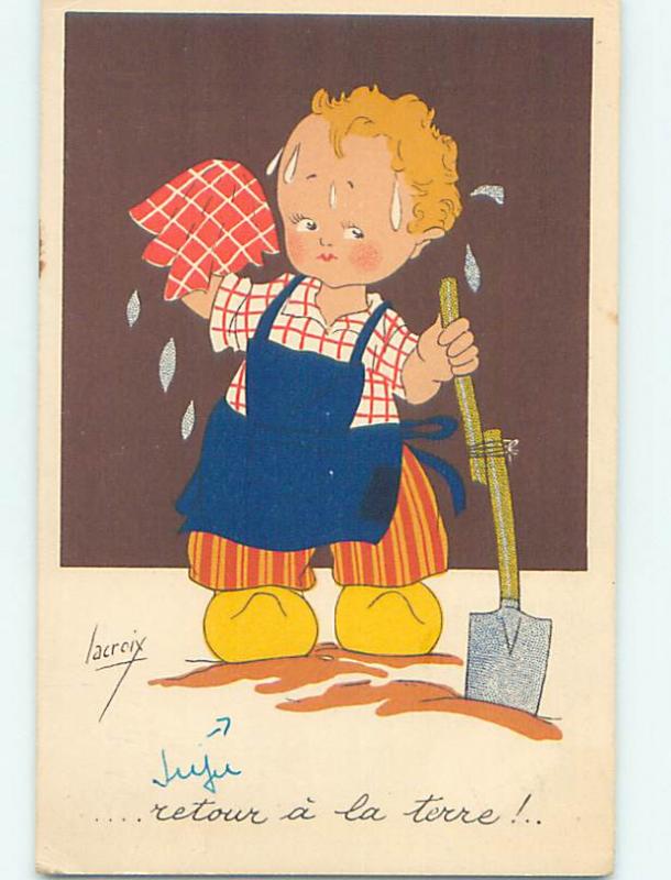 Pre-Chrome foreign signed FRENCH CHILD SWEATS WHILE USING A BROKEN SHOVEL J4995
