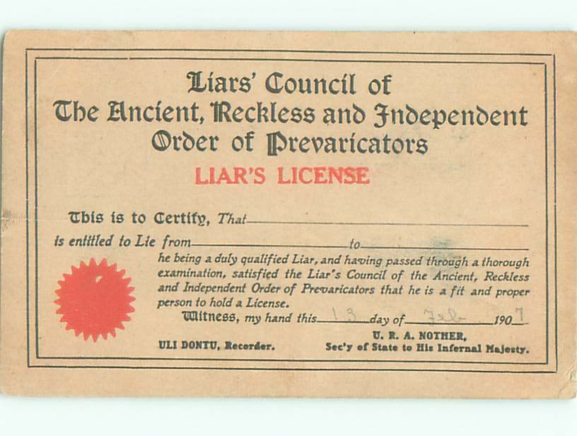 Pre-Linen Comic LIAR LICENSE ON POSTCARD AB9309