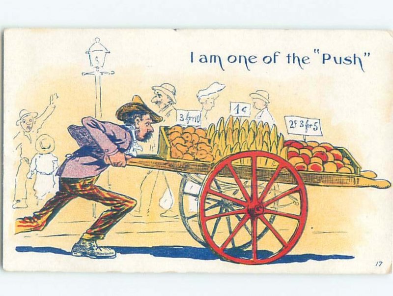 Pre-Linen Comic MAN PUSHING PRODUCE FRUIT CART AB8589