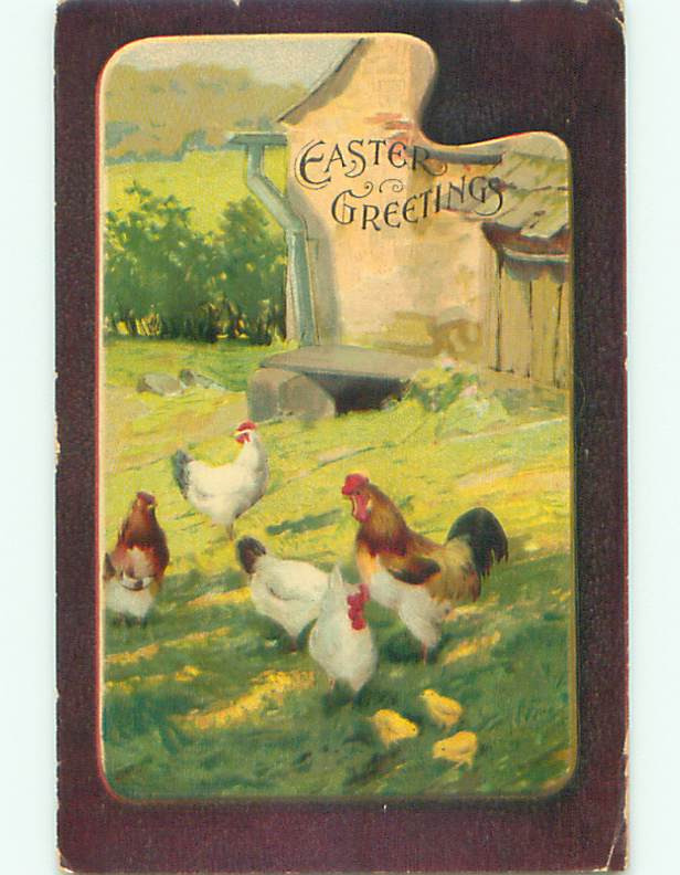 Pre-Linen easter CHICKENS WITH CHICKS IN BARNYARD k2554