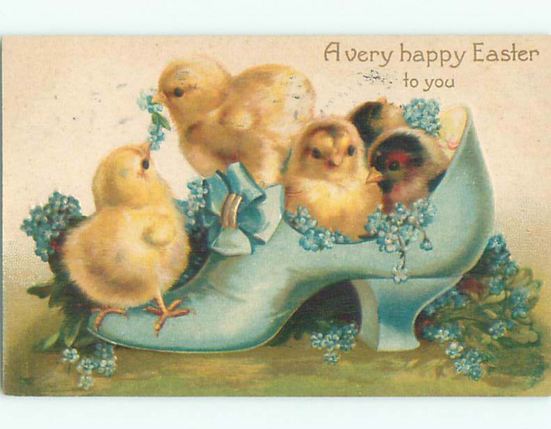 Pre-Linen easter CHICKS PLAYING IN WOMAN'S HIGH-HEELED SHOE k2751