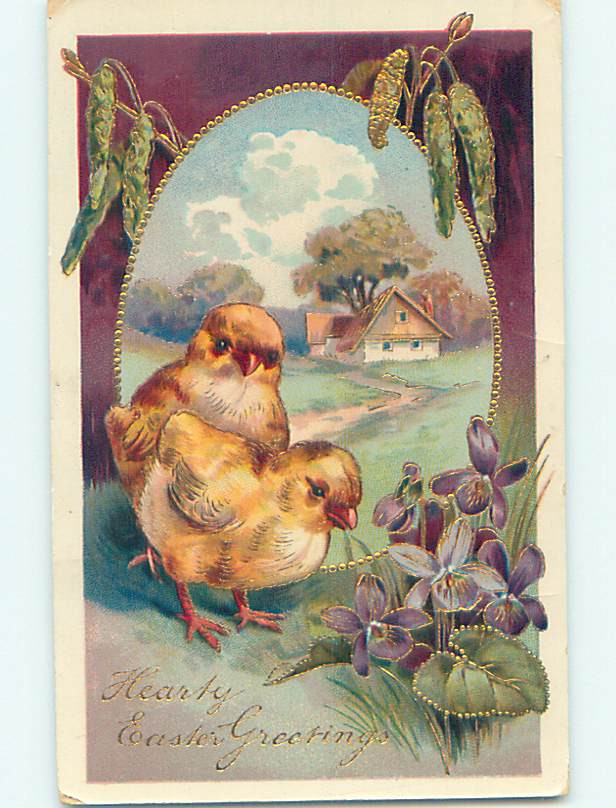 Pre-Linen easter CUTE LARGE CHICKS LOOKING AT VIOLET FLOWERS hr2600