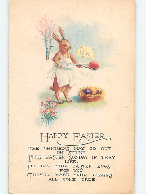 Pre-Linen easter HUMANIZED BUNNY RABBIT USES SPOON TO MOVE COLORED EGGS HL0611
