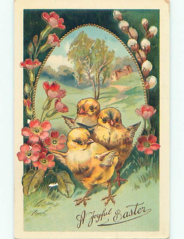 Pre-Linen easter PASTURE SCENE ON LARGE EGG WITH CHICKS k2288