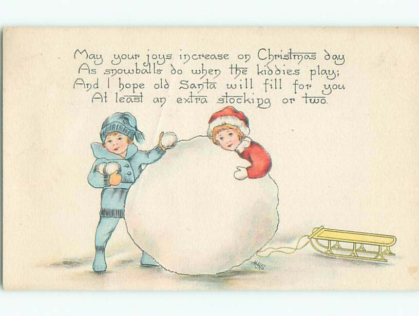 Pre-Linen signed BOY THROWS SNOWBALLS WHILE GIRL MAKES SNOWMAN J3658