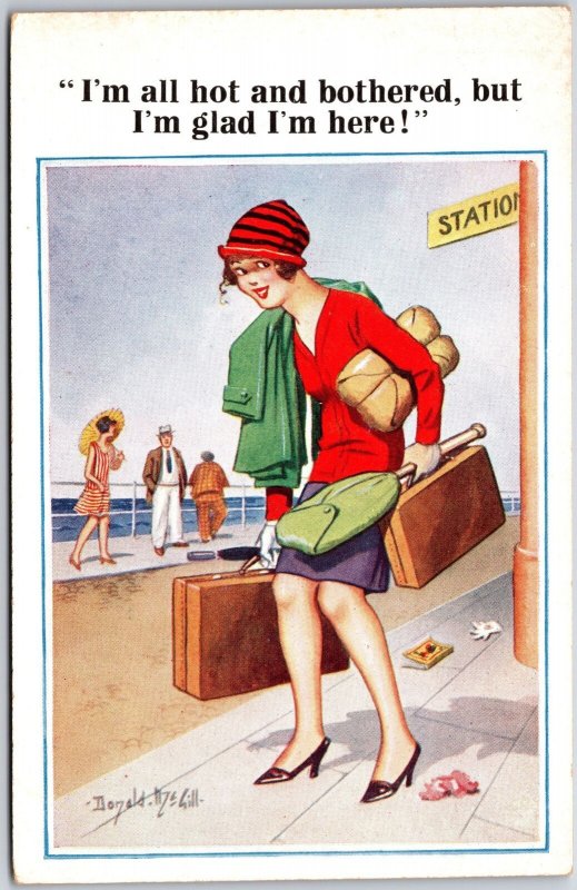 Pretty Lady All Hot And Bothered "Glad I'm Here" Comic Card Postcard