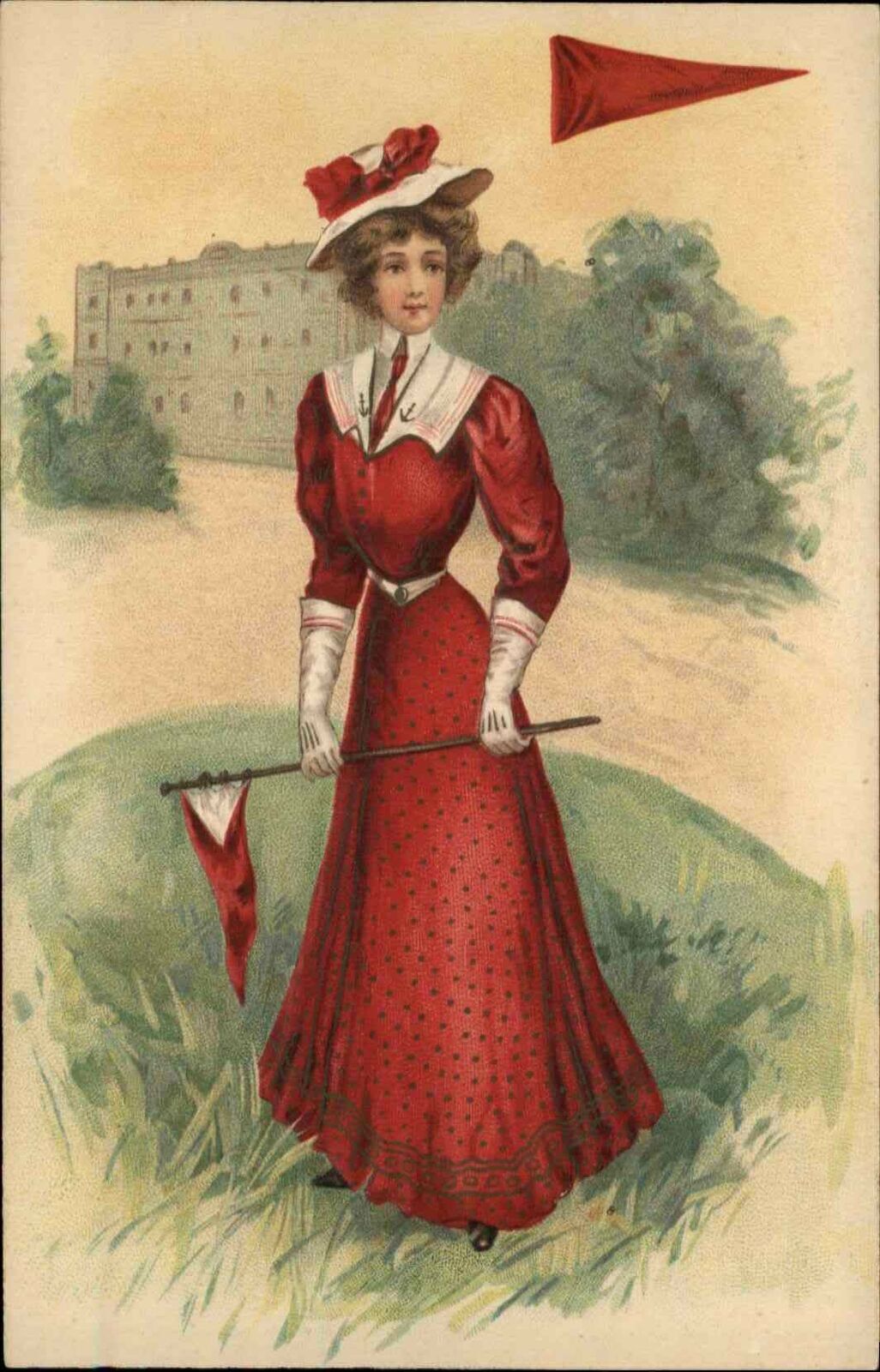 Pretty Woman in Red w Pennant Flag EMBOSSED c1910 Postcard