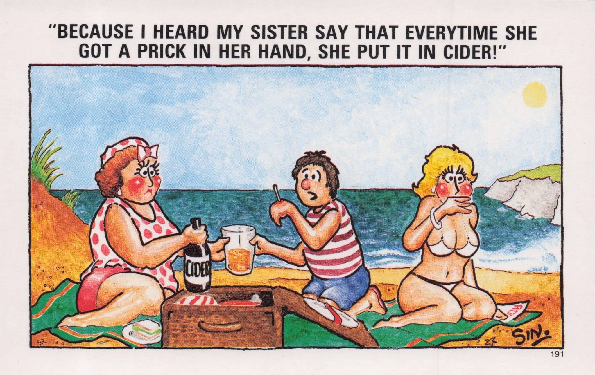 Prick In Hand Cider Drinking Beach Picnic Sexy Lady Comic Postcard