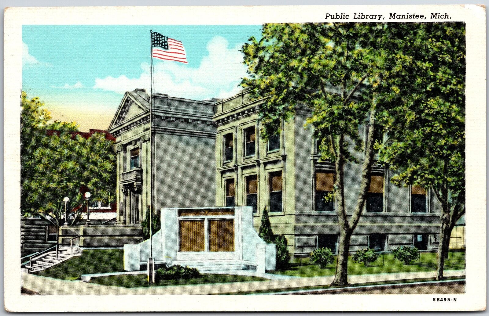 Public Library Manistee Michigan Flag on Grounds Building Postcard