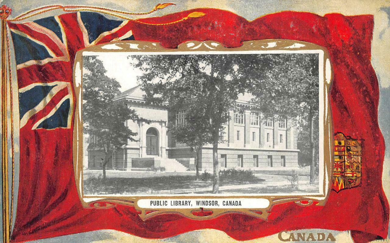 PUBLIC LIBRARY WINDSOR CANADA PATRIOTIC POSTCARD (c. 1910)