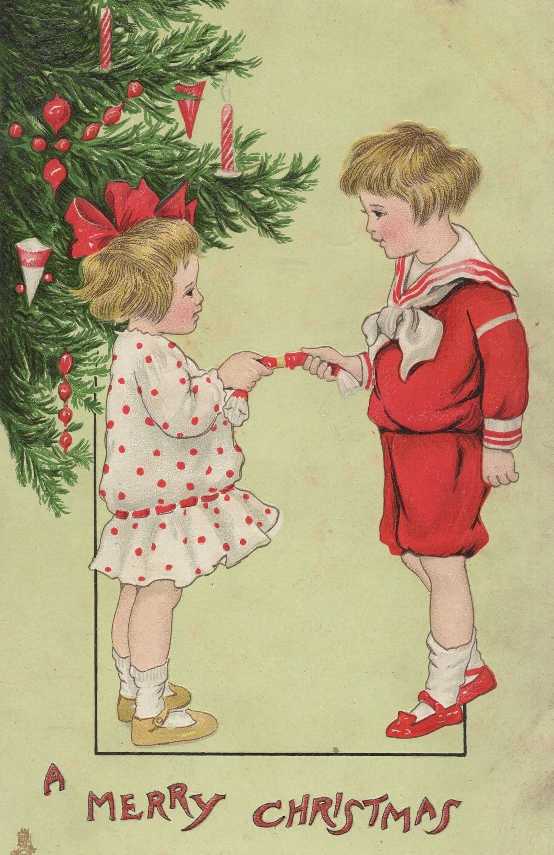 zx105 Antique postcard a little darkening in places but very good indeed and is really unusual to find a boy and girl pulling a cracker on an old Edwardian card - relief effect too (raised from surface adding to its character) - published by Tucks around 1910.