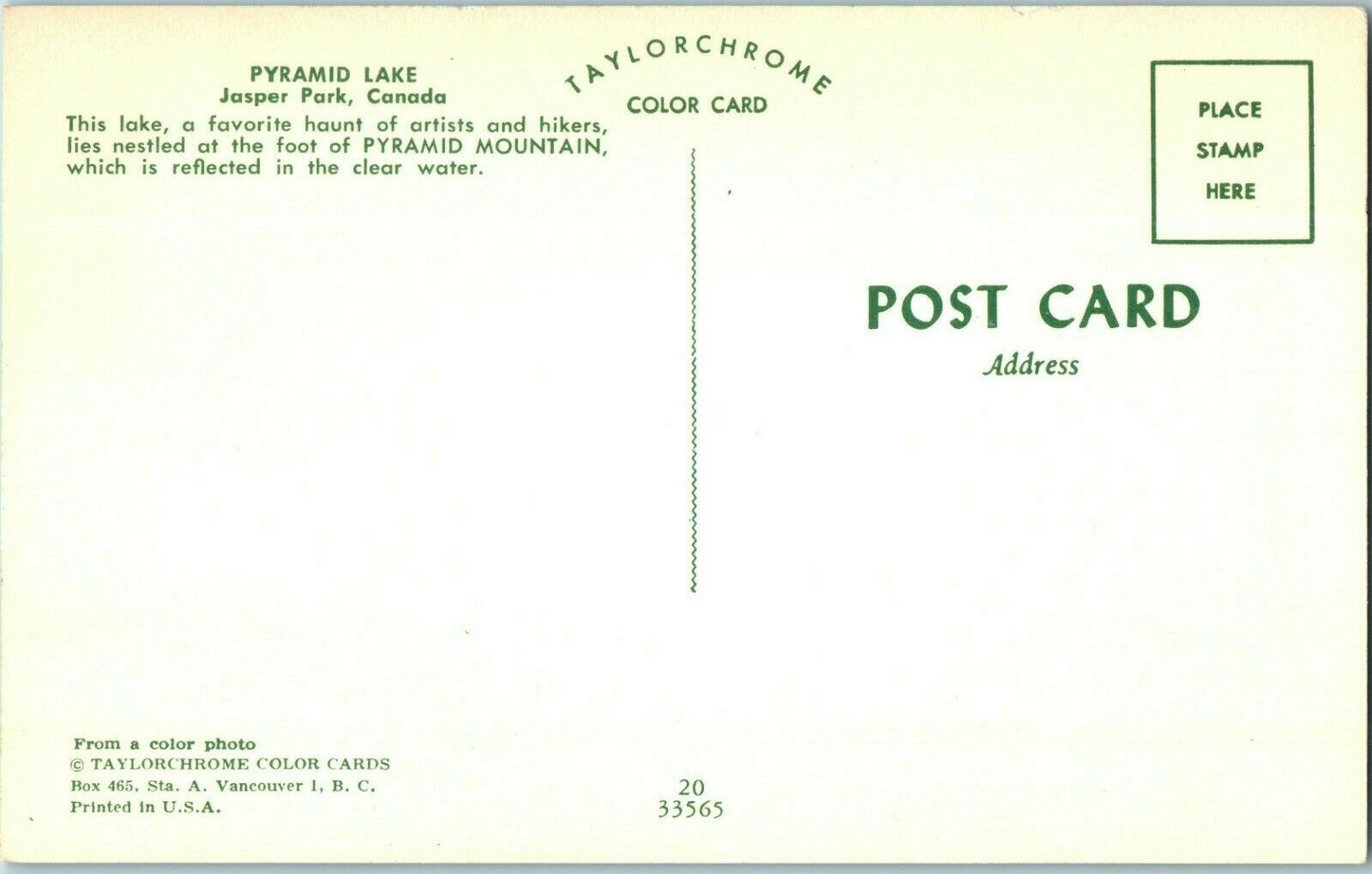 Condition: Pre-owned. Stored well. May have mild edgewear due to age. Typical. Pyramid Lake Jasper Park Canada Postcard