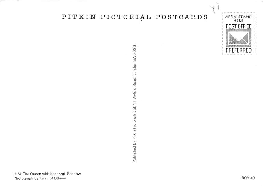 Queen With Her Corgi - Grade: 3 Category: Continental Size Postcard, Approx 4 in x 6 in (10 cm x 15.25 cm) Product Size: Continental size: 4X6 inches (10.5 cm x 15 cm) Grading Scale: Grade 1 = Perfect corners G ... Read More