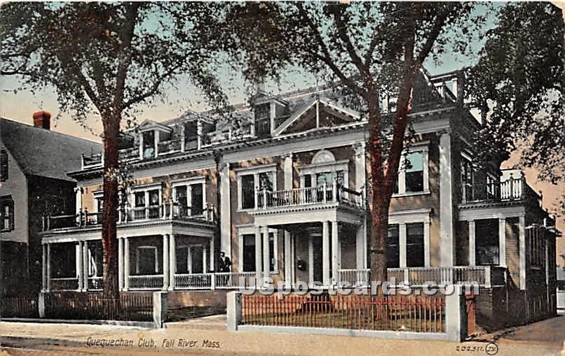Quequechan Club - Fall River, MA Postcard - 1909 Grade: 2 Size: R - Regular size: Approx 3 1/2 X 5 1/2 inch (9 cm X 14 cm) Grading Scale: Grade 1 = Perfect corners Grade 2 = Very Minimal corner wear, no crease ... Read More