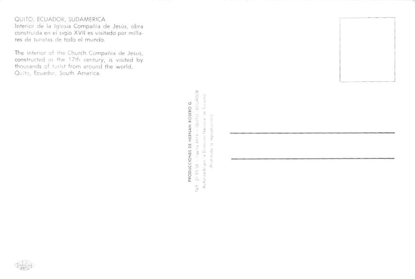 Quito - Ecuador Grade: 1 Category: Continental Size Postcard, Approx 4 in x 6 in (10 cm x 15.25 cm) Product Size: Continental size: 4X6 inches (10.5 cm x 15 cm) Grading Scale: Grade 1 = Perfect corners Grade 2 ... Read More