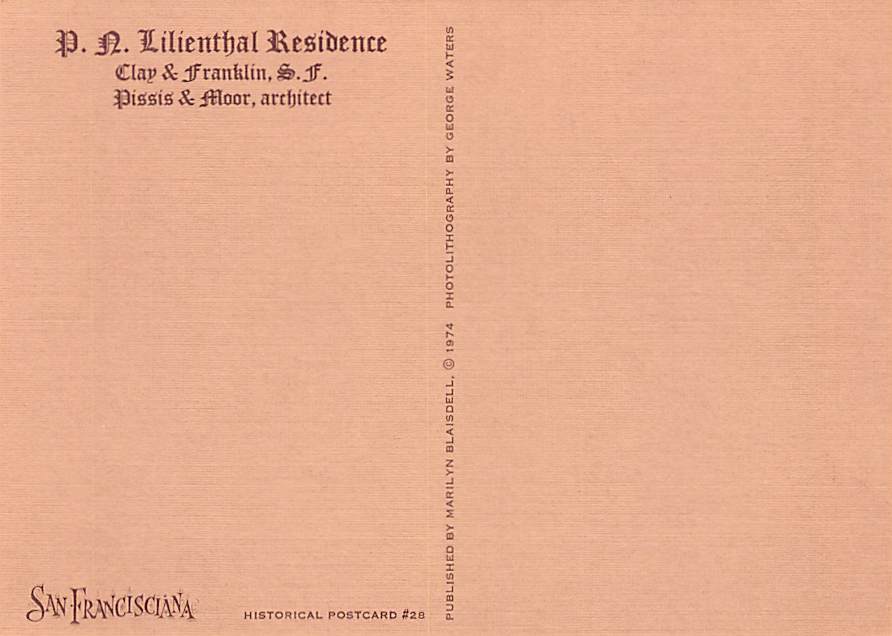 RA Lilienthal Residence - San Francisciana Grade: 1 Category: Continental Size Postcard, Approx 4 in x 6 in (10 cm x 15.25 cm) Product Size: Continental size: 4X6 inches (10.5 cm x 15 cm) Grading Scale: Grade ... Read More