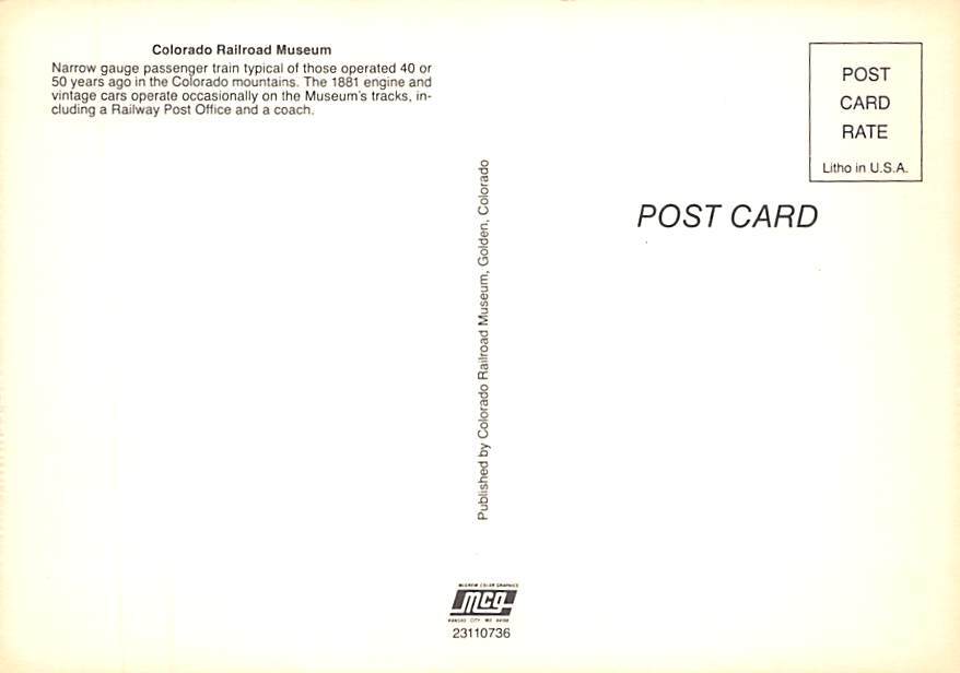 Railroad Museum Railroad Museum, Colorado Postcard - View Images Grade: 1 Size: {{Product Field 5 (Size Regular or Continental)}} - Continental Size Postcard - approximately 4 inch X 6 inch (15 CM X 10.5 CM) Gra ... Read More