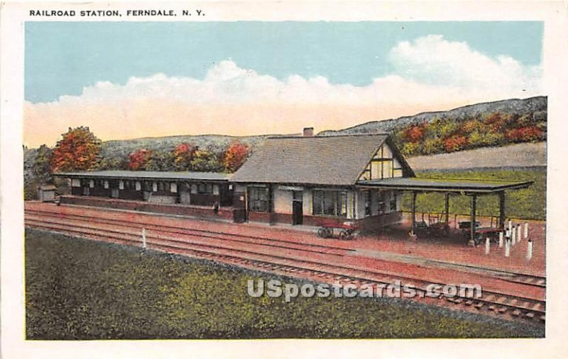Railroad Station - Ferndale, New York Postcard - Unused Grade: 2 Size: R - Regular size: Approx 3 1/2 X 5 1/2 inch (9 cm X 14 cm) Grading Scale: Grade 1 = Perfect corners Grade 2 = Very Minimal corner wear, no ... Read More