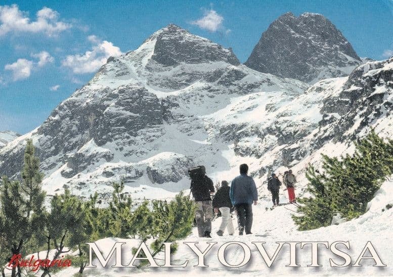 ts200 Malyovitsa is a peak in the northwestern part of the Rila Mountain in southwestern Bulgaria. It is 2,729 m high and is one of the most popular tourist regions in the mountain. Its northern and eastern slopes are steep and almost inaccessible while the southern and south-western slopes are more oblique. This beautiful 1990s postcard shows tourists rambling through the local snow covered mountains with small corner fraying otherwise unused and mint