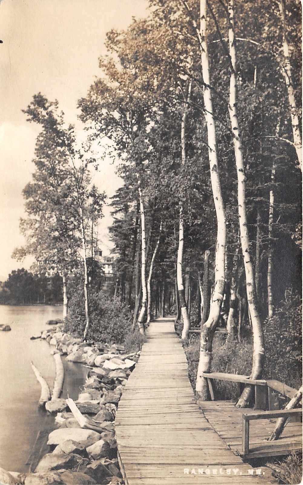Rangeley Maine~Boardwalk by Lake~Bench Built Around Birch Trees~c1910 RPPC
