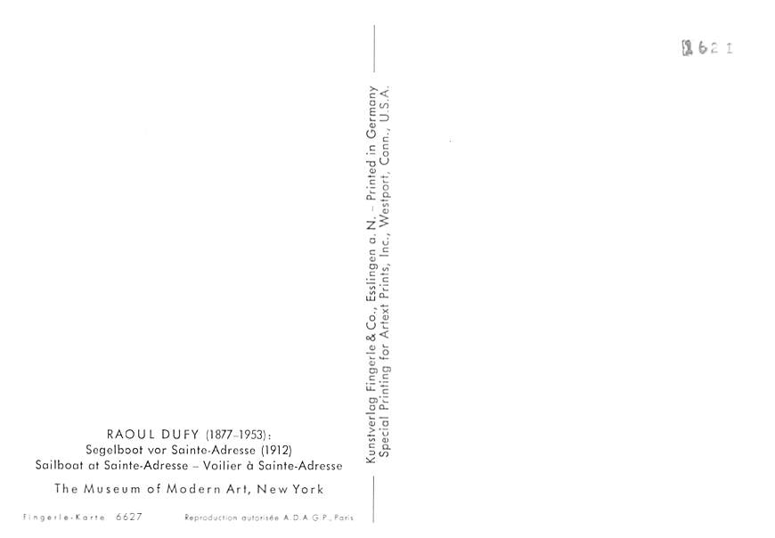 Raoul Dufy - Segelboot vor Sainte Adresse Grade: 1 Category: Continental Size Postcard, Approx 4 in x 6 in (10 cm x 15.25 cm) Product Size: Continental size: 4X6 inches (10.5 cm x 15 cm) Grading Scale: Grade 1 ... Read More
