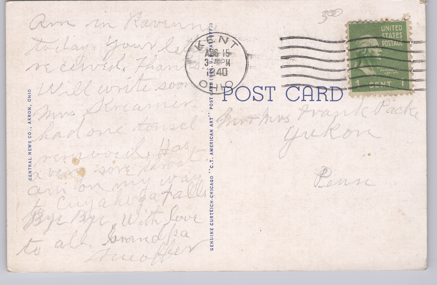 See awesome photos for condition - Postmarked Kent, Ohio, Aug 15, 1940 - R.2 / OB30 / Central News Co. / C.T. American Art