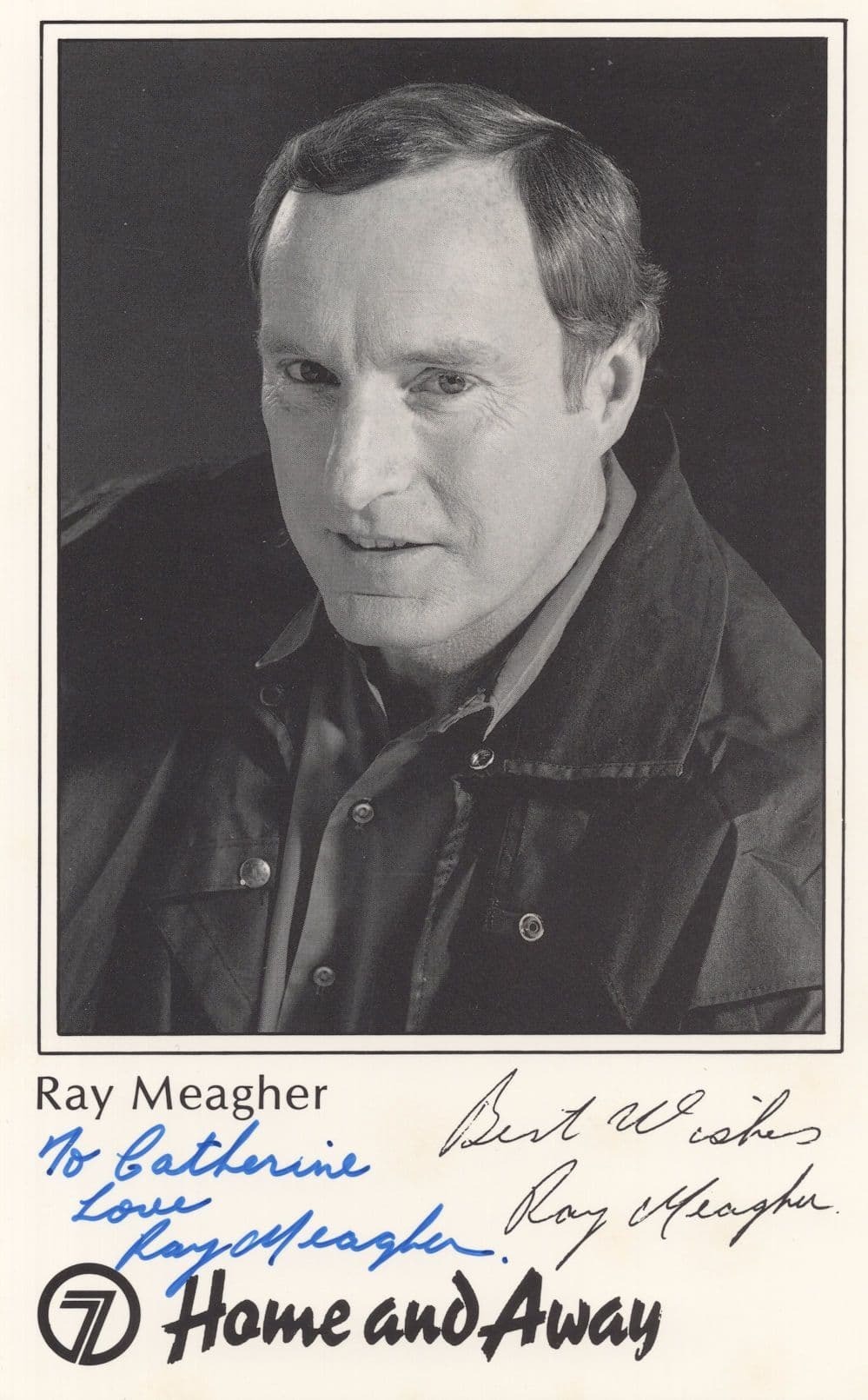 CHAU3145 This is a rare 7" x 5" hand signed photo for Ray Meagher of Neighbours who has personally autographed the souvenir where his signature rests perfectly accompanying his portrait and also has a pre printed signing of Ray Meagher too (so two autographs). This is his official Australian 7 TV show souvenir from when the show was being broadcast. It is mint condition.