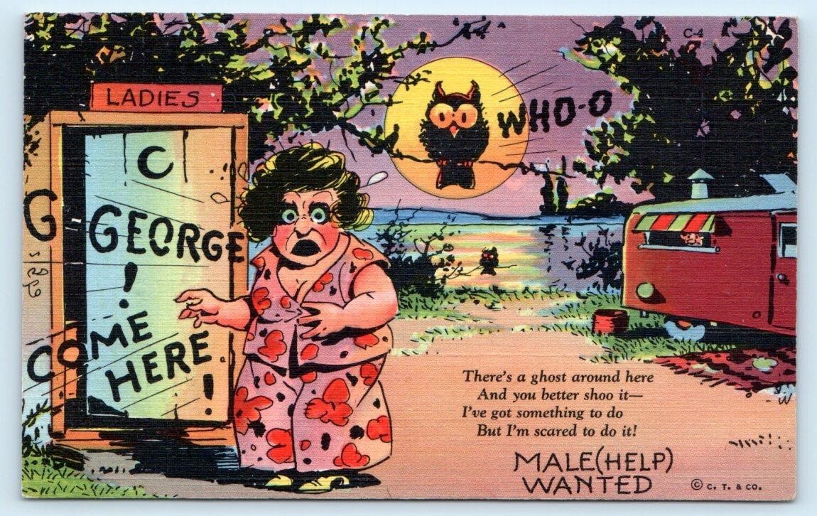 RAY WALTERS Comfort Comics OUTHOUSE, CAMPING TRAILER Owl c1930s Postcard