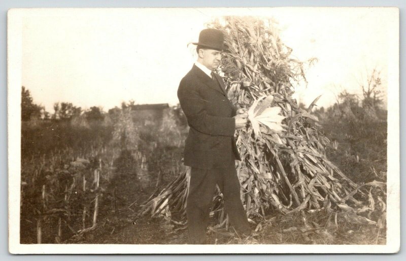 Real Photo Postcard~Businessman Examines Corn by Shuck Stack~Farm~c1912 RPPC