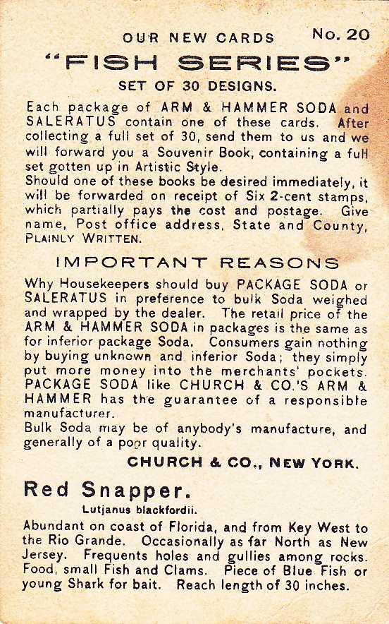 Red Snapper - Fish Series 1900. Arm & Hammer Trade Card. Actual size about 3.45 x 2.95 inches (75 x 47 mm). Our New Cards Fish Series - #20. Copyright 1900 by Church & Dwight of NYC. Average condition.