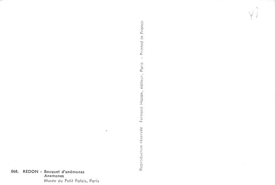 Redon, Anemones Postcard Grade: 1 Size: Continental Size - approximatly 4 Inch x 6 Inch (15 cm x 10.5) Grading Scale: Grade 1 = Perfect corners Grade 2 = Very Minimal corner wear, no creases Grade 3 = Some cor ... Read More