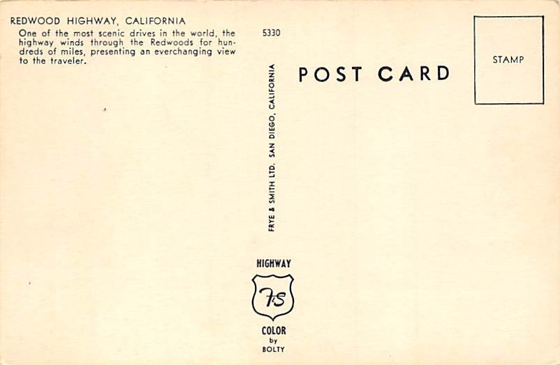 Redwood Highway Redwood Highway CA Postcard - Unused Grade: 2 Size: R - Regular size: Approx 3 1/2 X 5 1/2 inch (9 cm X 14 cm) Grading Scale: Grade 1 = Perfect corners Grade 2 = Very Minimal corner wear, no cr ... Read More