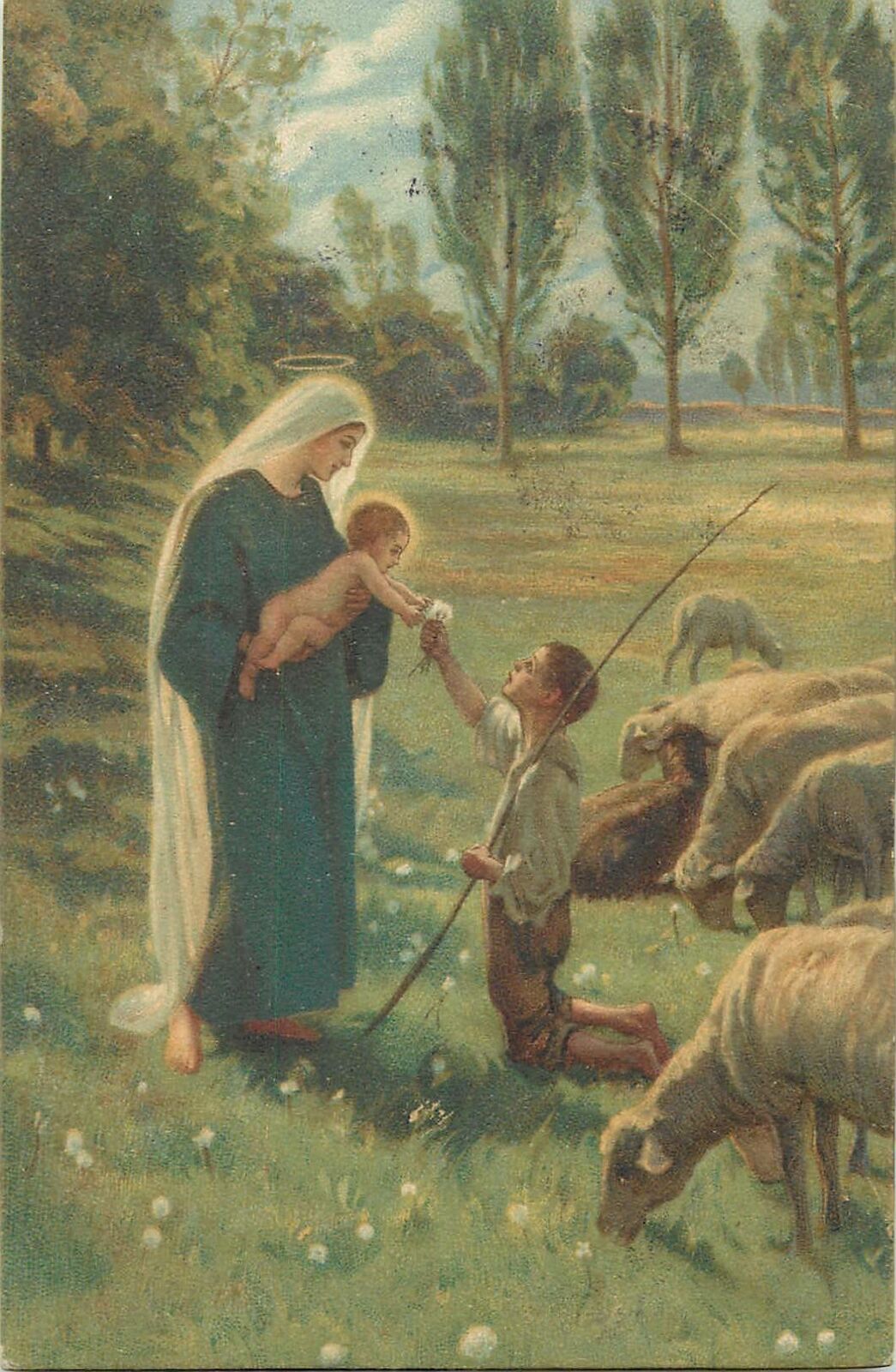 Religion Sheep flock shepherd adoring Jesus legend Postcard