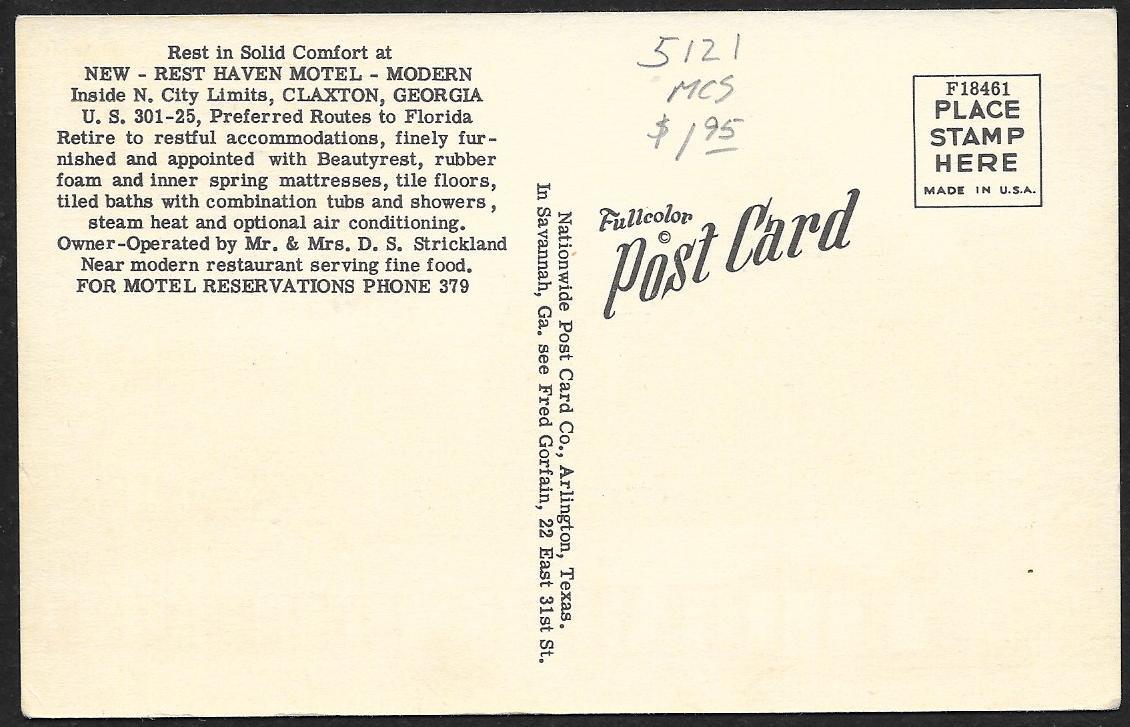 Rest Haven Motel Claxton Georgia Unused c1940s
