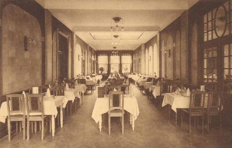 zx807 Antique rare postcard of the interior of the Restaurant inside the Memlinc Hotel Blankenberghe with tables laid ready for dinner to be served to the patrons circa 1910 unused and mint.