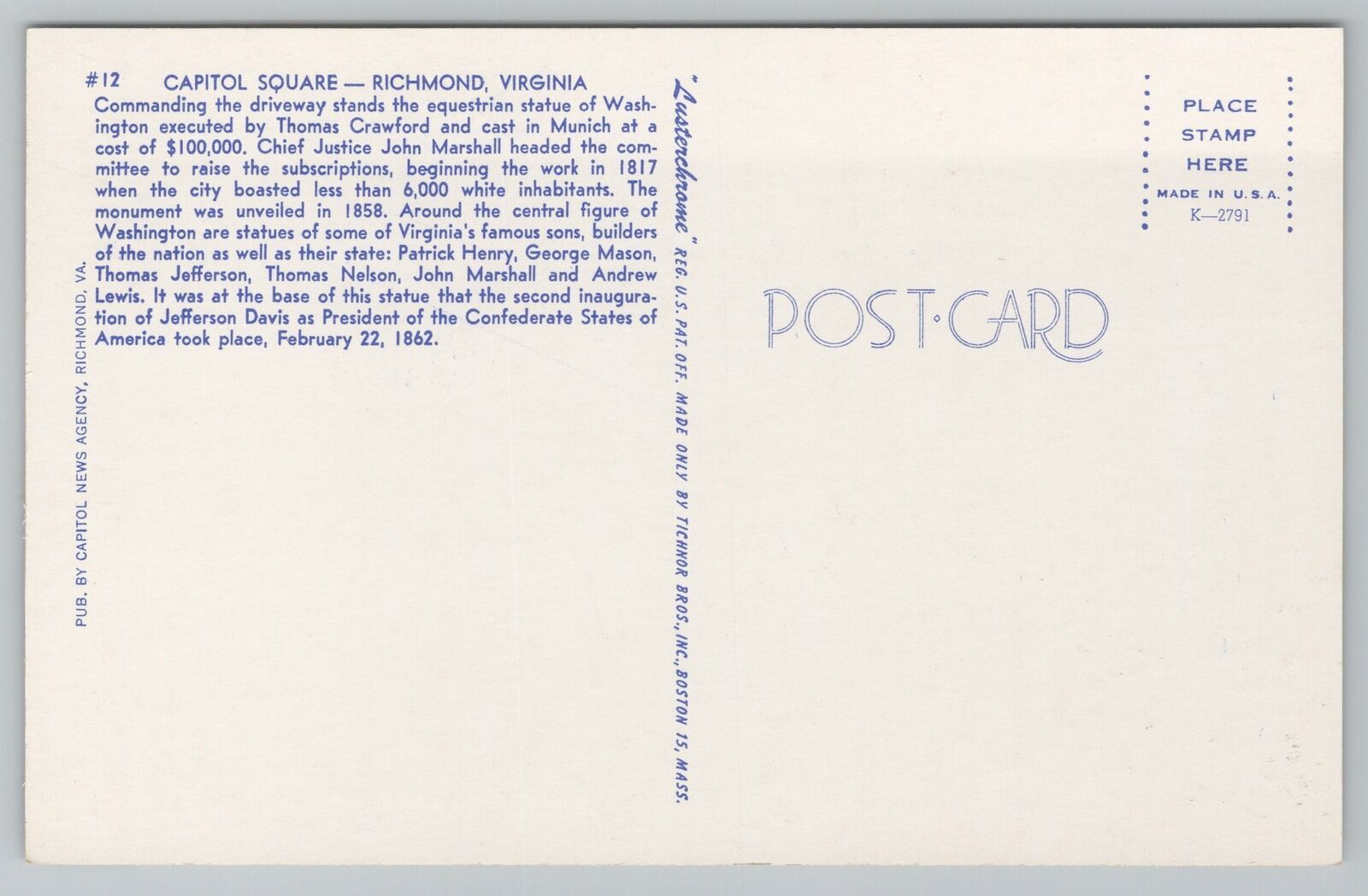 Richmond Virginia~Capitol Square Statue~Vintage Postcard